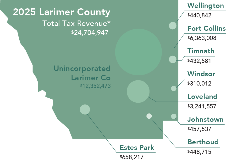 Revenue from the ¼ - cent Help Preserve Open Spaces sales and use tax is shared among Larimer County and eight municipalities. The tax renewed in 2014, took effect in 2019, and sunsets in 2043. It is not imposed on food or prescription drugs. The total revenue collected to date is more than $380 million. Distributions to municipalities are based upon the highest yield of either population or sales tax generation. This revenue sharing agreement ensures that residents throughout Larimer County receive benefits from the Help Preserve Open Spaces sales and use tax.